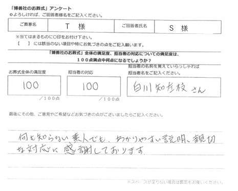 【公式】家族葬のはくぜん|山形県山形市の葬儀・お葬式(博善社) > お客様の声 > 桜田 T様 火葬式 満足度100点