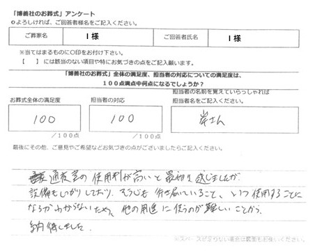 桧町 I様 小さい家族葬 満足度100点 2025年12月18日 通夜室の使用料が高いと最初は感じましたが、設備もしっかりしており そうじも行き届いてること、いつ使用することになるかわからないため、他の用途に使うのが難しいことから納得しました。
